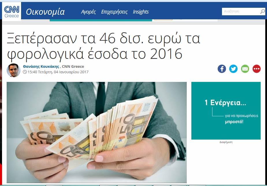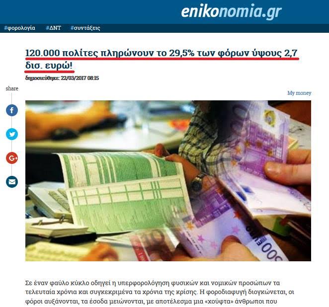 “Η φοροδιαφυγή διογκώνεται, οι φόροι αυξάνονται, τα έσοδα μειώνονται, με αποτέλεσμα μια «χούφτα» άνθρωποι που αντιπροσωπεύουν το 1,6% (120.000) των φορολογουμένων να καλούνται να πληρώσουν 2,7 δισ.ευρώ ή διαφορετικά το 29,5% του συνόλου του φόρου εισοδήματος.”