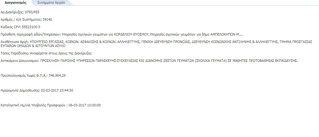 “Σύμφωνα με την έκθεση του Λογιστηρίου του Κράτους που παρουσιάζει η ThessNews, ο προϋπολογισμός από τα 11,5 εκ. ευρώ πέφτει μόλις στα 875.000 ευρώ, υπολογίζοντας σχολικά γεύματα για 10.000 μαθητές (από 30.000 που είχε αρχικά εξαγγελθεί) προς 2,5 ευρώ ανά γεύμα για 35 σχολικές ημέρες. Μετά την ψήφιση της τροπολογίας στη Βουλή, το υπουργείο αποφασίζει να εφαρμόσει διαδικασίες – εξπρές, ώστε να ξεκινήσουν τα σχολικά γεύματα άμεσα. Προκηρύσσει διαγωνισμό με αντικείμενο «ΠΡΟΣΚΛΗΣΗ ΠΑΡΟΧΗΣ ΥΠΗΡΕΣΙΩΝ ΠΑΡΑΣΚΕΥΗΣ-ΣΥΣΚΕΥΑΣΙΑΣ ΚΑΙ ΔΙΑΝΟΜΗΣ ΖΕΣΤΩΝ ΓΕΥΜΑΤΩΝ (ΣΧΟΛΙΚΑ ΓΕΥΜΑΤΑ) ΣΕ ΜΑΘΗΤΕΣ ΠΡΩΤΟΒΑΘΜΙΑΣ ΕΚΠΑΙΔΕΥΣΗΣ» με προϋπολογισμό, χωρίς Φ.Π.Α., 746.964,29 ευρώ.