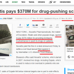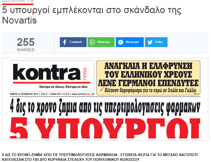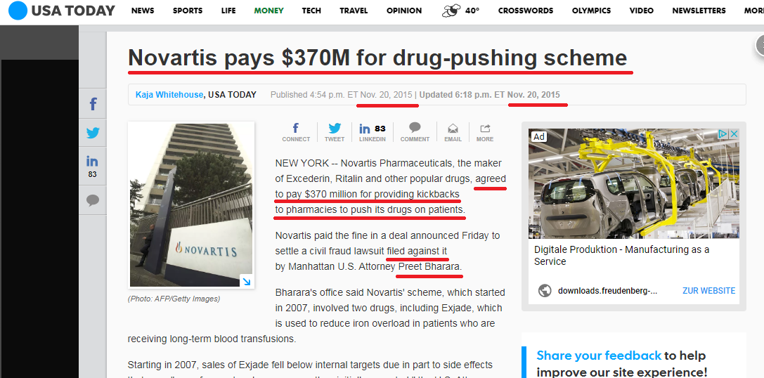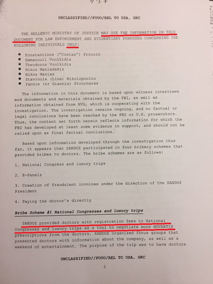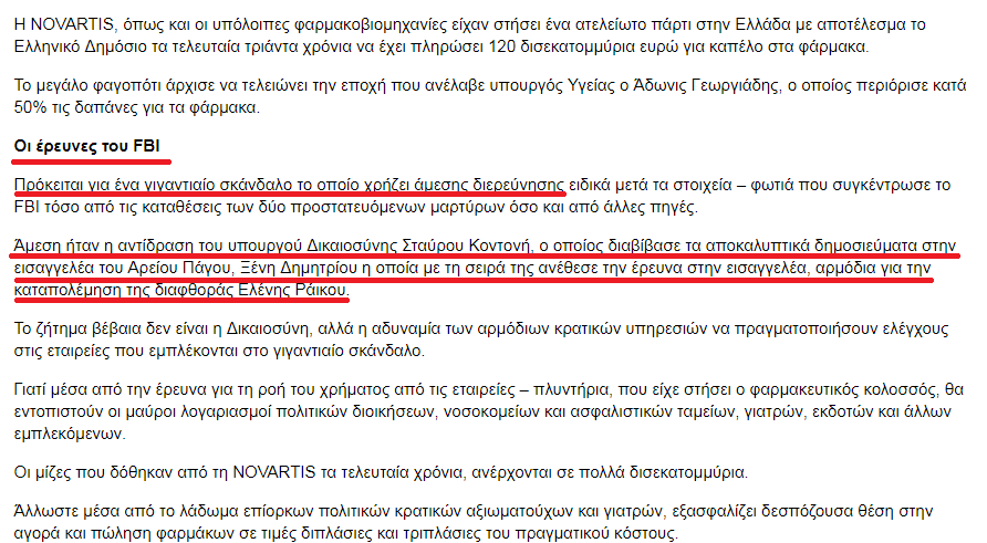 του Μιχάλη Χαιρετάκη Αν ψάξει κανείς στο Google με κλειδιά fbi και novartis δε θα βρει ουτε μια αναφορά σε αμερικάνικο site γιατί πολύ απλά η ιστορία για την αμερικάνικη δικαιοσύνη έχει κλείσει απο το 2015. Σύμφωνα με δημοσιεύματα του αμερικάνικου τύπου στις 20 Νοεμβρίου 2015 η Novartis σύμφώνησε να πληρώσει αποζημίωση ύψους 370.000.000 δολαρίων ΗΠΑ και έκλεισε το θέμα. Μήν ακούτε λοιπόν ανοησίες οτι συνεχίζεται η έρευνα στις ΗΠΑ,οι ΗΠΑ δεν είναι φιλάνθρωποι για να συνεχίζουν έρευνες για λογαριασμό ξένων χωρών ,ούτε βέβαια έχουν καμμία δικαιοδοσία.