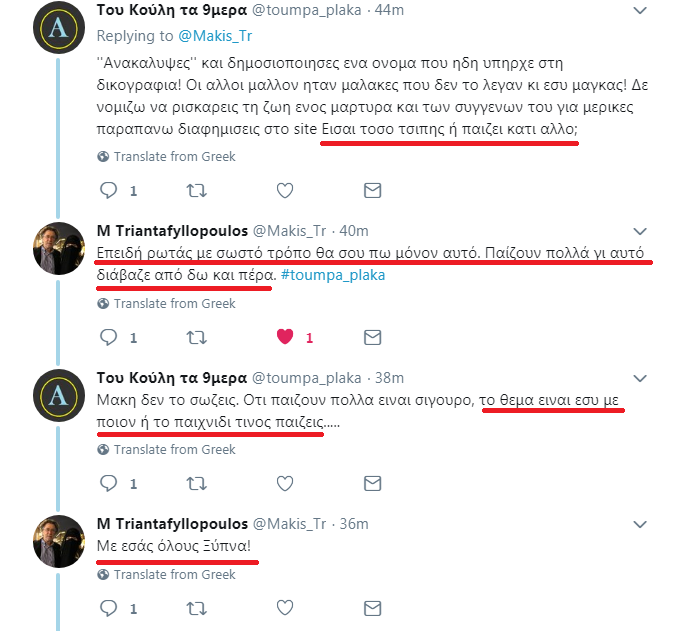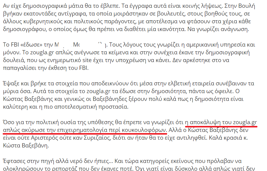 Στη συνέχεια γίνεται το απίστευτο: Μοιράζεται η δικογραφία και “ξεχνούν” να ελέγξουν οτι στα έγγραφα του FBI υπάρχει το όνομα μιας απο τους μάρτυρες. Ο Μάκης Τριανταφυλλόπουλος απο τη zougla.gr αποκαλύπτει το όνομα και ο Κώστας Βαξεβάνης τον βρίζει χυδαία απο το twitter λέγοντάς τον ουσιαστικά ρουφιάνο. Ο Μάκης δεν αντέχει την “αδικία” και σε διάλογο στο twitter σε ερώτηση “Με ποιον είσαι” απαντάει “Με εσάς όλους ξύπνα”
