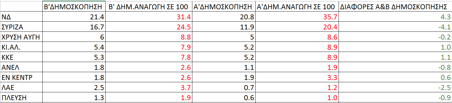 Σε εναν πίνακα αφαιρώντας λευκό, αναποφάσιστους, δεν ξέρω / δεν απαντώ, βλέπετε τα ποσοστά των δημοσκοπήσεων με αναγωγή στο 100%.