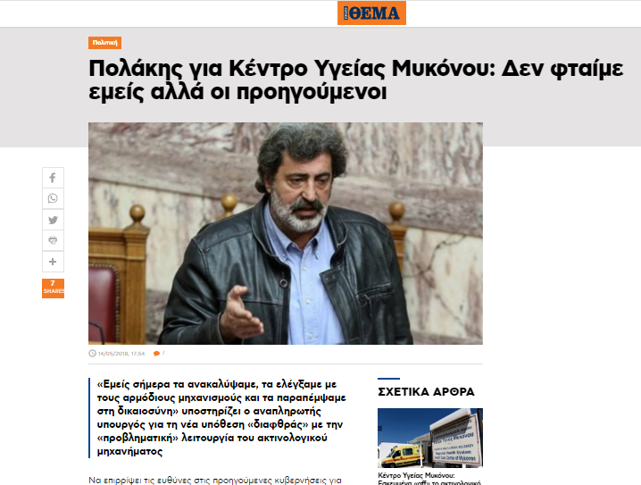 “Όσον αφορά τα σημερινά δημοσιεύματα που αφορούν το ΚΥ Μυκόνου έχω να δηλώσω τα εξής. Πρώτον, το πόρισμα του ΣΕΥΥΠ αφορά τα πεπραγμένα των προηγούμενων κυβερνήσεων που είχαν στόχο την αποδόμηση του δημόσιου συστήματος υγείας. Εμείς σήμερα τα ανακαλύψαμε, τα ελέγξαμε με τους αρμόδιους μηχανισμούς και τα παραπέμψαμε στη δικαιοσύνη.”