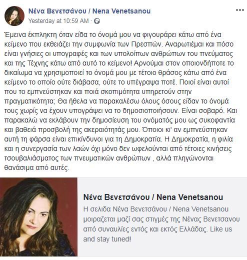 «Έμεινα έκπληκτη όταν είδα το όνομά μου να φιγουράρει κάτω από ένα κείμενο που εκθειάζει την συμφωνία των Πρεσπών. Αναρωτιέμαι και πόσο είναι γνήσιες οι υπογραφές και των υπολοίπων ανθρώπων του πνεύματος και της Τέχνης κάτω από αυτό το κείμενο! Αρνούμαι στον οποιονδήποτε το δικαίωμα να χρησιμοποιεί το όνομά μου με τέτοιο θράσος κάτω από ένα κείμενο το οποίο ούτε διάβασα, ούτε το υπέγραψα ποτέ. Ποιοί είναι αυτοί που το εμπνεύστηκαν και ποιά σκοπιμότητα υπηρετούν στην πραγματικότητα; Θα ήθελα να παρακαλέσω όλους όσους είδαν το όνομά τους χωρίς να έχουν υπογράψει να το δημοσιοποιήσουν. Είναι σοβαρό. Και παρακαλώ να εκλάβουν την δημοσίευση του ονόματός μου ως συκοφαντία και βαθειά προσβολή της ακεραιότητάς μου.